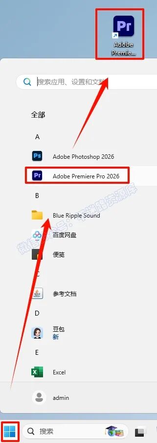 6.点击“开始“菜单栏,点击“所有应用“,找到“Adobe Premiere Pro“软件,鼠标左键拖拽到桌面上即可创建桌面快捷方式