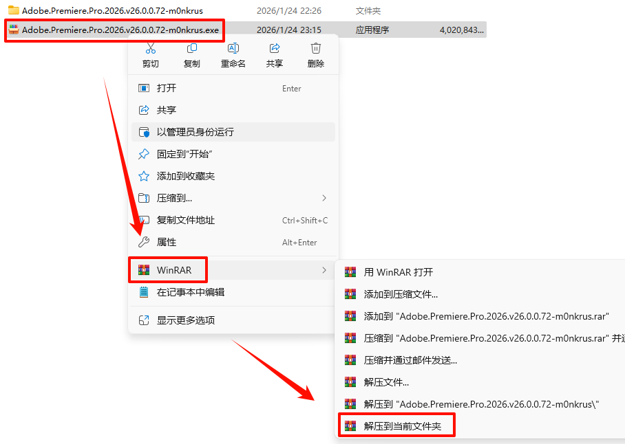 1.进入下载链接下载“Adobe.Premiere.Pro.2026.v26.0.0.72-m0nkrus“安装包,选中下载的安装包,鼠标右键选择“解压到当前文件夹”