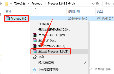 1.´ò¿ªÏÂÔØµÄÈí¼þ°²×°°ü£¬Êó±êÓÒ»÷¡¾Proteus8.6¡¿Ñ¹Ëõ°ü£¬Ñ¡Ôñ¡¾½âѹµ½Proteus8.6¡¿¡£
