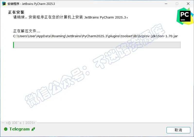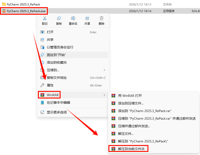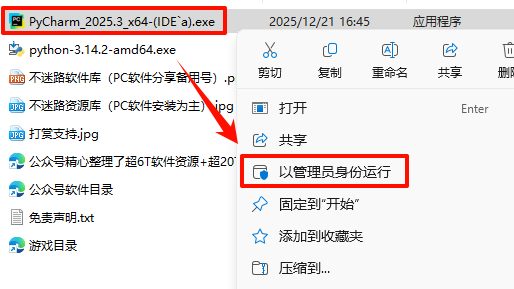 8.返回解压的文件夹,鼠标右键点击“PyCharm_2025.3_x64-(IDE`a).exe”选择“以管理员身份运行”