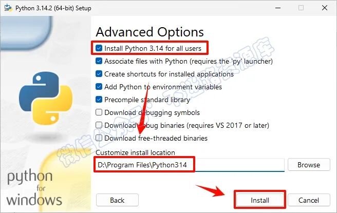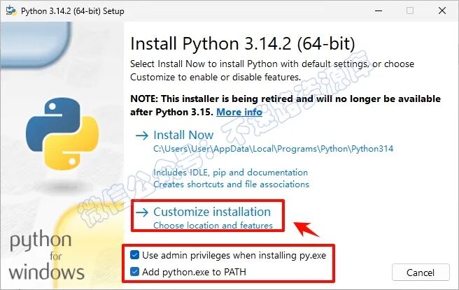 3.勾选““Add Python...“和“Use admin privileges....”,点击“Customize installation“