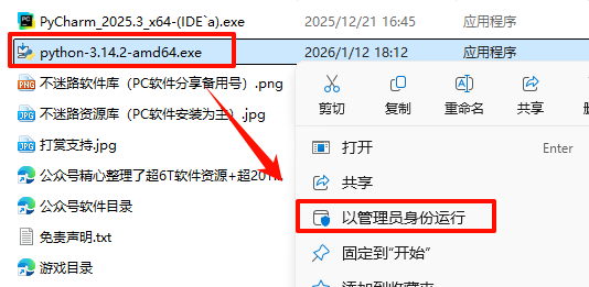 2.打开刚刚解压的文件夹,鼠标右键点击“python-3.14.2-amd64.exe”选择“以管理员身份运行”