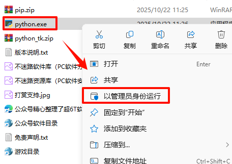 2.打开刚刚解压的文件夹,鼠标右键点击“python.exe”选择“以管理员身份运行”
