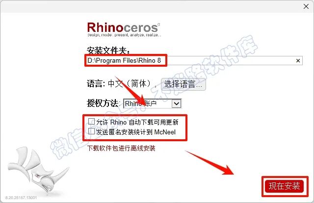 4.Ñ¡ÔñÈí¼þ°²×°Â·¾¶£¬½¨ÒéºÍ½Ì³ÌÖеı£³ÖÒ»Ö£¬±¾Àý°²×°µ½DÅÌ£¨½«Â·¾¶µØÖ·ÖеÄÊ××Ö·ûC¸ÄΪD±íʾ°²×°µ½DÅÌ£¬°²×°Â·¾¶²»Òª³öÏÖÖÐÎÄ£©,È¡Ïû¹´Ñ¡“ÔÊÐíRhino×Ô¶¯ÏÂÔØ¿ÉÓøüДºÍ“·¢ËÍÄäÃû°²×°Í³¼Æ...”£¬µã»÷“ÏÖÔÚ°²×°”