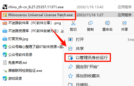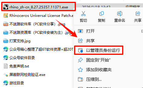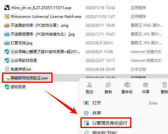 7.·µ»ØÖ®Ç°½âѹµÄ“Rhino 8.27.25357.11371“Îļþ¼Ð£¬Êó±êÓÒ¼üµã»÷“ÆÁ±ÎÁªÍø¼ì²âÑéÖ¤.exe”Ñ¡Ôñ“ÒÔ¹ÜÀíÔ±Éí·ÝÔËÐД