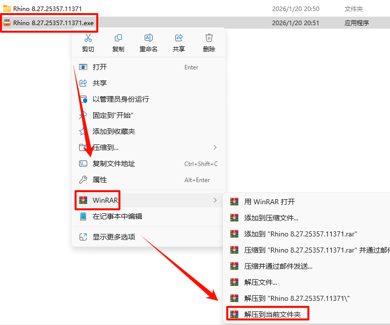 2.´ò¿ª¸Õ¸Õ½âѹµÄÎļþ¼Ð£¬Êó±êÓÒ¼üµã»÷“rhino_zh-cn_8.27.25357.11371.exe”Ñ¡Ôñ“ÒÔ¹ÜÀíÔ±Éí·ÝÔËÐД