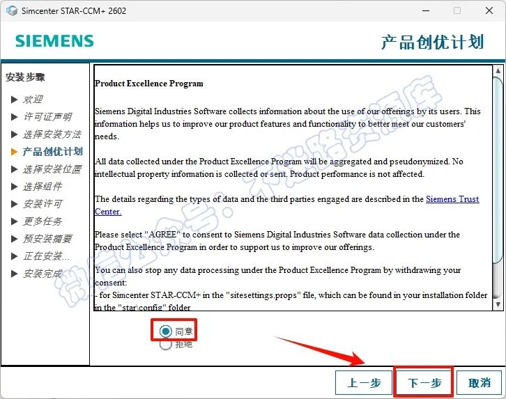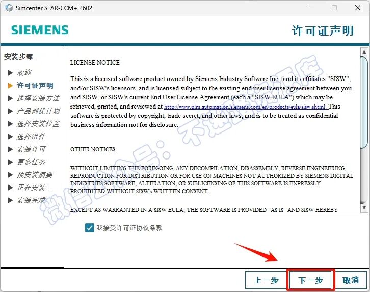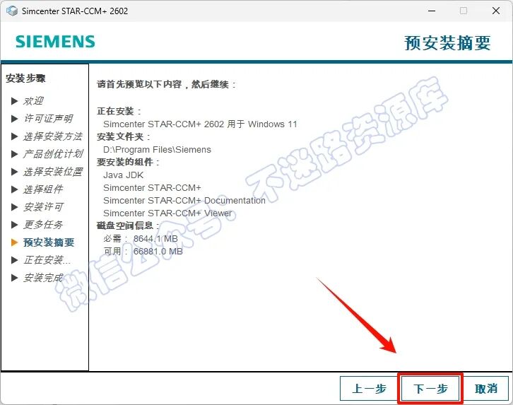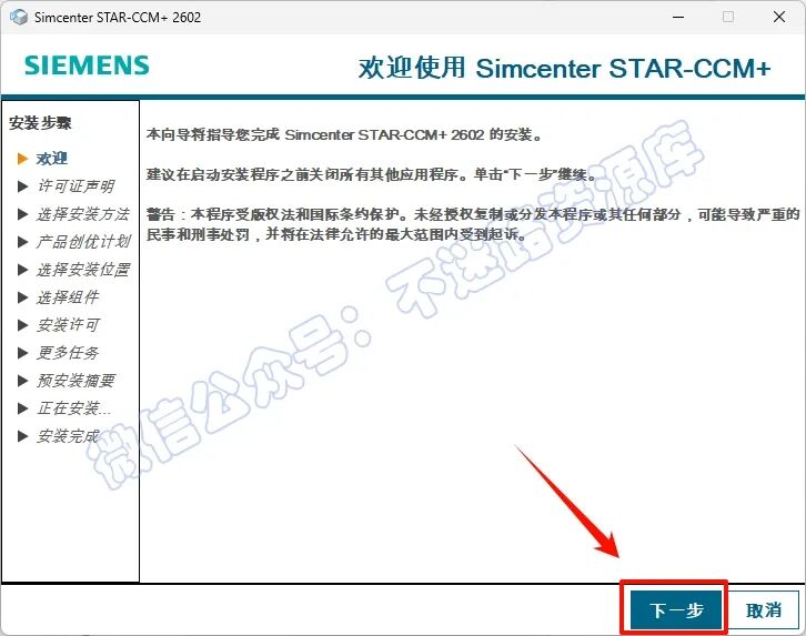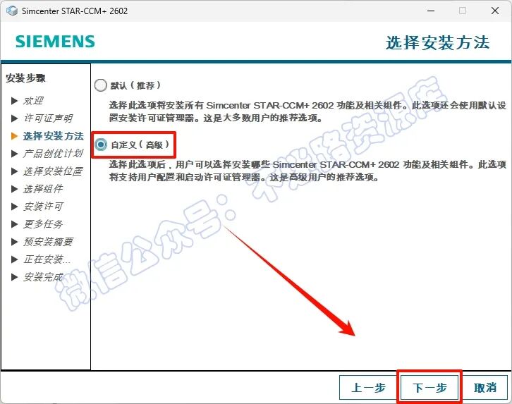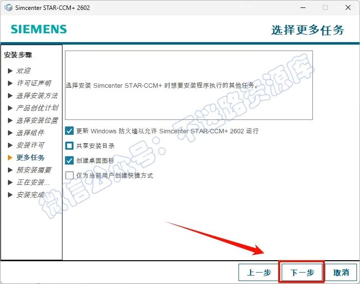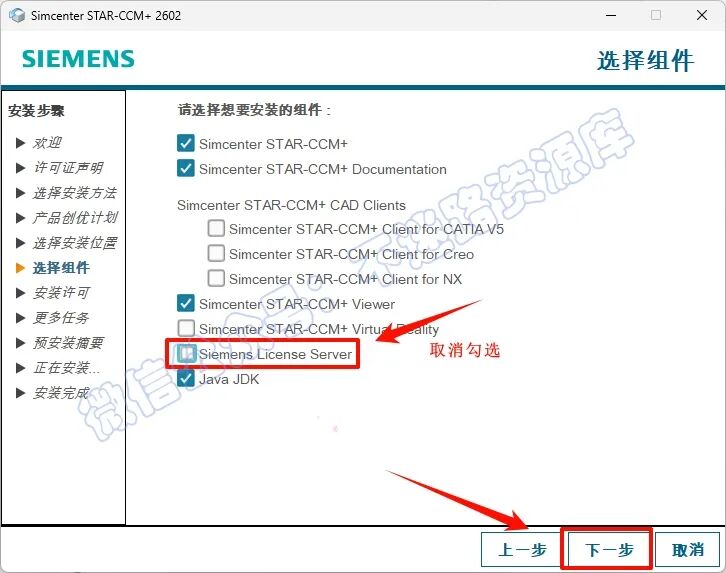 10.È¡Ïû¹´Ñ¡“Siemens License Server”(Îñ±ØÈ¡Ïû¹´Ñ¡£¬·ñÔò»á°²×°Ê§°Ü)£¬¸ù¾Ý×Ô¼ºµÄÐèҪѡÔñ×é¼þ£»×¢Òâ“Simcenter STAR-CCM+ CAD Clients”ÕâÒ»ÏÊÇÖ¸ÔÚËùÁгöµÄCADÈí¼þÖа²×°Ò»¸öÖ±½ÓÏòSTAR-CCM+´«Êä3DÊý¾ÝµÄ²å¼þ£¬Ç°ÌáÊǵ±Ç°µçÄÔÉÏÒѾ°²×°ÁËCADÈí¼þ£¬µã»÷“ÏÂÒ»²½”