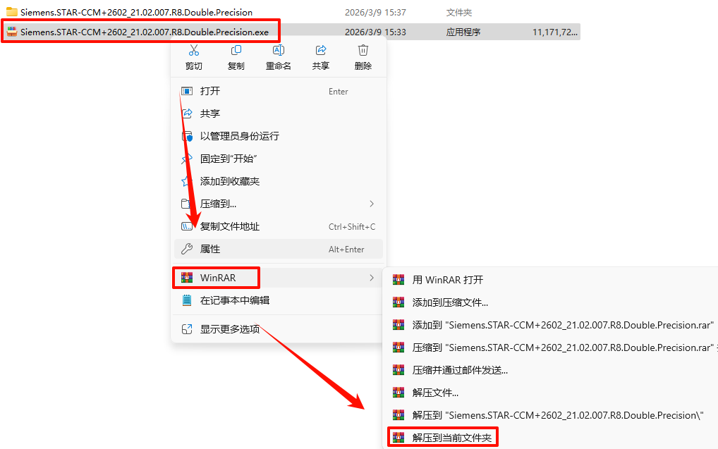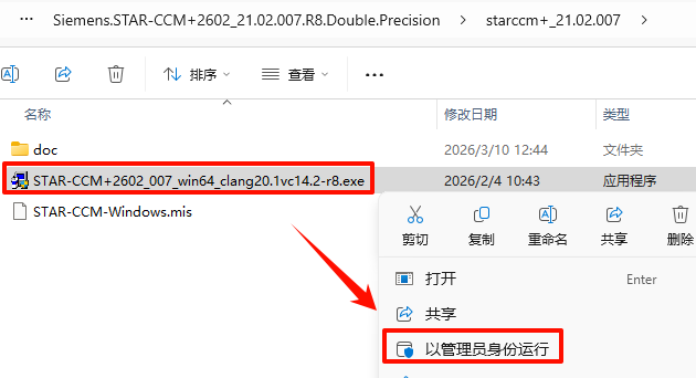 2.´ò¿ª¸Õ¸Õ½âѹµÄÎļþ¼Ð£¬Ë«»÷´ò¿ª“starccm+_20.06.007”Îļþ¼Ð£¬Êó±êÓÒ¼üµã»÷“STAR-CCM+2602_007_win64_clang20.1vc14.2-r8.exe”Ñ¡Ôñ“ÒÔ¹ÜÀíÔ±Éí·ÝÔËÐД