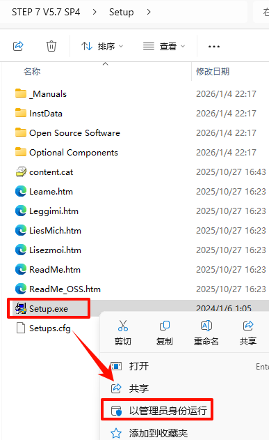 21.·µ»ØÖ®Ç°½âѹµÄ“STEP 7 V5.7 SP4“Îļþ¼Ð£¬Êó±êÓÒ¼üµã»÷“Sim_EKB_Install_2025_12_04_Run_as_Admin.exe”Ñ¡Ôñ“ÒÔ¹ÜÀíÔ±Éí·ÝÔËÐД
