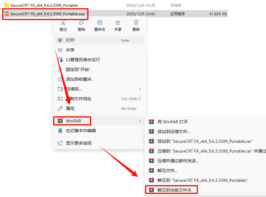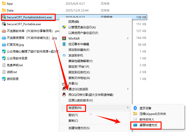 2.打开刚刚解压的文件夹,鼠标右键点击“SecureCRT_Portable(Admin).exe”选择“发送到”——“桌面快捷方式”