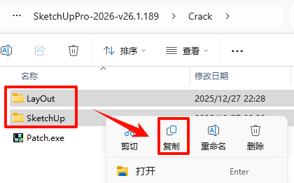 6.返回之前解压的“SketchUpPro-2026-v26.1.189”文件夹,双击打开“Crack”文件夹,选中“SketchUp”和“LayOut”文件夹,鼠标右键选择“复制”