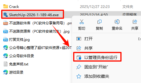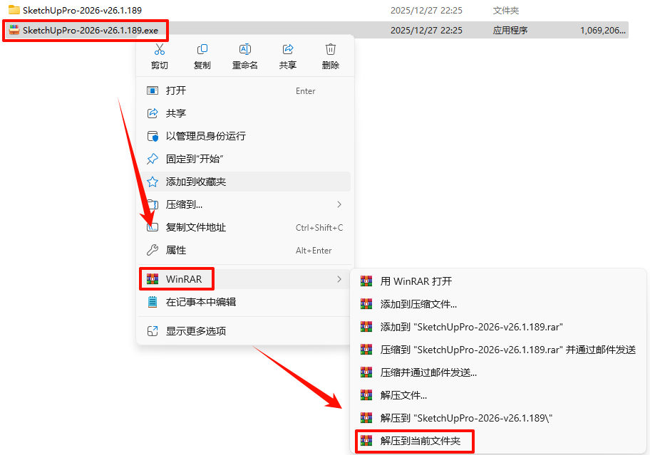 2.打开刚刚解压的文件夹,鼠标右键点击“SketchUp-2026-1-189-46.exe