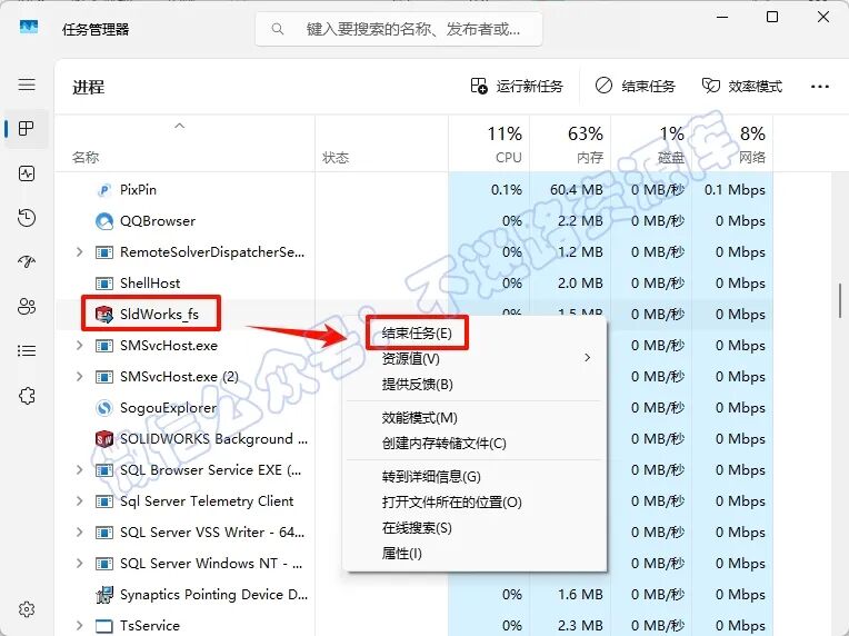 24.´ò¿ªÈÎÎñ¹ÜÀíÆ÷£¨Í¬Ê±°´×¡ESC+Shift+Ctrl£©,ÕÒµ½²¢Ñ¡ÖГsldworks_fs”Ñ¡ÏîÊó±êÓÒ¼üÑ¡Ôñ“½áÊø½ø³Ì“