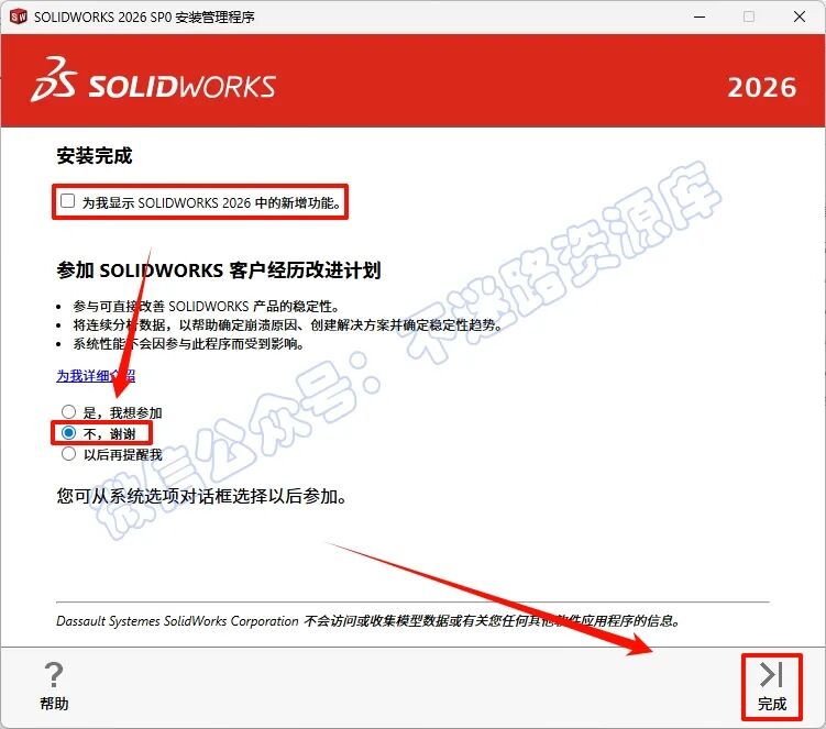 20.È¡Ïû¹´Ñ¡“ΪÎÒÏÔʾSolidWorks 2026 ÖеÄÐÂÔö¹¦ÄÜ”£¬µãÑ¡"²»£¬Ð»Ð»"£¬µã»÷"Íê³É"