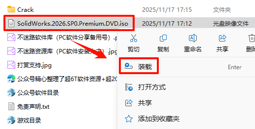 9.·µ»Ø½âѹµÄ”SolidWorks 2026“Îļþ¼Ð,Ñ¡ÖГSolidWorks.2026.SP0.Premium.DVD.iso”Îļþ£¬Êó±êÓÒ¼üÑ¡Ôñ“×°ÔØ”£¨Èç¹ûûÓÐ“×°ÔØ”Ñ¡ÏîµÄ¿ÉÒÔÓÒ¼üÑ¡Ôñ“´ò¿ª·½Ê½—Windows×ÊÔ´¹ÜÀíÆ÷”´ò¿ª£©