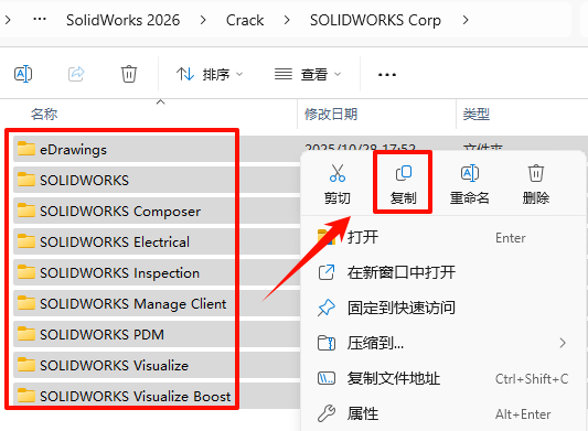 25.·µ»Ø”Crack“Îļþ¼Ð£¬Ë«»÷”SOLIDWORKS Corp“Îļþ¼Ð£¬Ñ¡ÖÐÈ«²¿Îļþ£¬Êó±êÓÒ¼üÑ¡Ôñ“¸´ÖÆ”