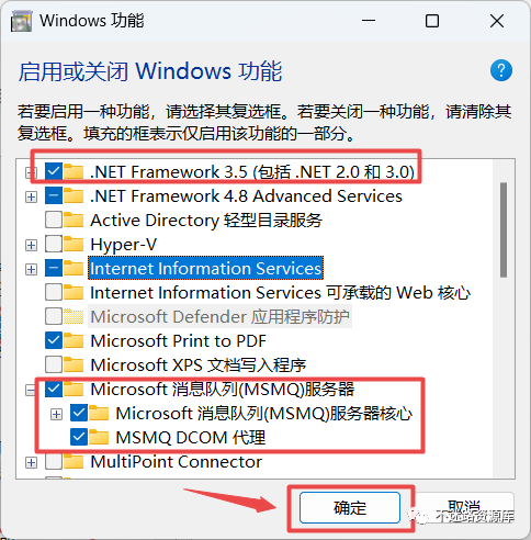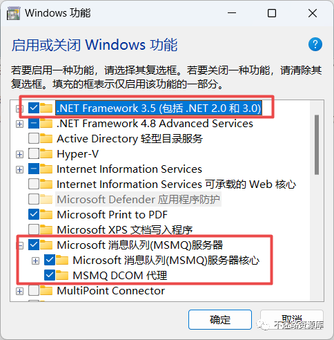 如果没有安装按以下步骤操作,点选“.NET Framework 3.5”和“Microsoft消息队列(MSMQ)服务”,点击“确定”,等待更改完成,点击“关闭”(若出现其他提示点击“让Windows更新为你下载文件”,等待下载安装完成即可)