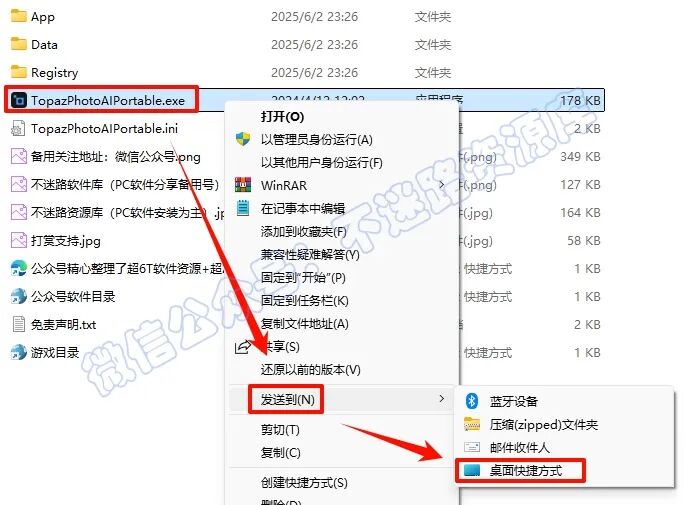 2.打开刚刚解压的文件夹,按住Shift鼠标右键“PhotoAIportable.exe”文件,点击“发送到”——“桌面快捷方式”、