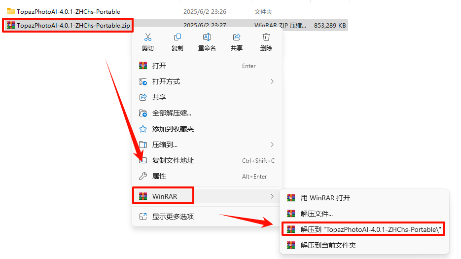 1.选中下载的压缩包,然后鼠标右键选择解压到"TopazPhotoAI-4.0.1-ZHChs-Portable"