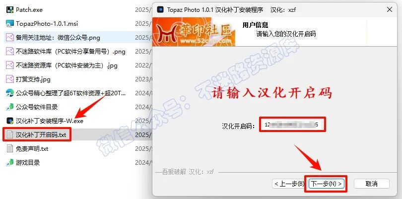 18.返回安装包,输入安装包里面的汉化补丁开启密码,点击“下一步”