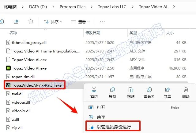 13.找到并选中复制过来的“TopazVideoAI-7.x-Patch.exe”文件,鼠标右键选择“以管理员身份运行”
