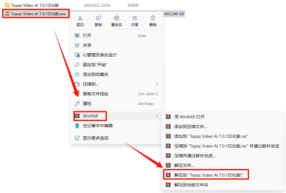 1.选中下载的压缩包,然后鼠标右键选择解压到"Topaz Video AI 7.0.1汉化版"