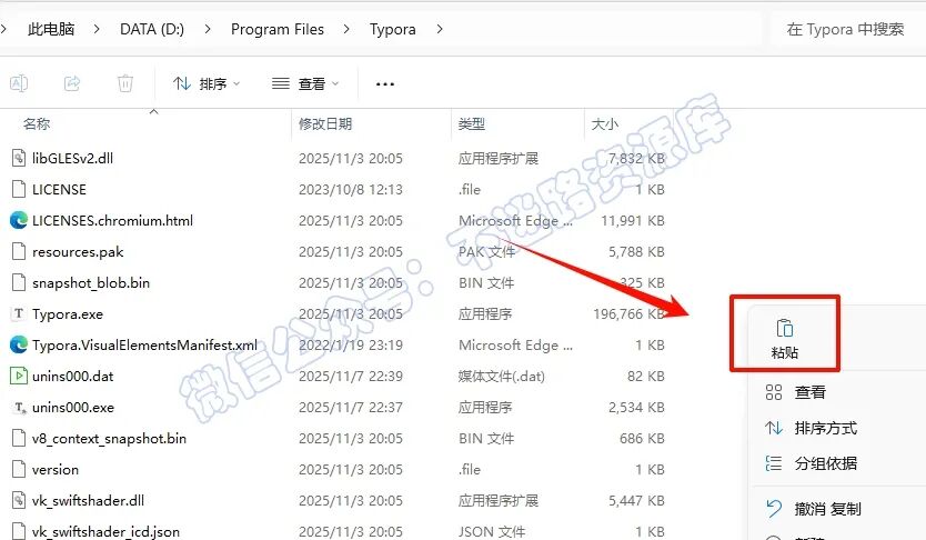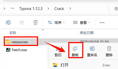 9.·µ»ØÖ®Ç°½âѹµÄ“Typora v1.12.3”Îļþ¼Ð£¬Ë«»÷´ò¿ª“Crack”Îļþ¼Ð£¬Ñ¡ÖГresources”Îļþ¼Ð£¬Êó±êÓÒ¼üµã»÷“¸´ÖÆ”