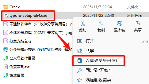 2.´ò¿ª¸Õ¸Õ½âѹµÄÎļþ¼Ð£¬Êó±êÓÒ¼üµã»÷“typora-setup-x64.exe”Ñ¡Ôñ“ÒÔ¹ÜÀíÔ±Éí·ÝÔËÐД