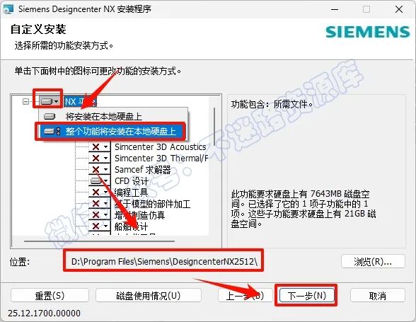 12.点击“NX平台倒三角展开符“,选择“整个功能将安装到本地硬盘上“,点击“浏览”选择软件安装路径,建议和教程中的保持一致,本例安装到D盘(将路径地址中的首字符C改为D表示安装到D盘,只更改盘符,其它尽量不要修改,安装路径不要出现中文),点击“下一步”