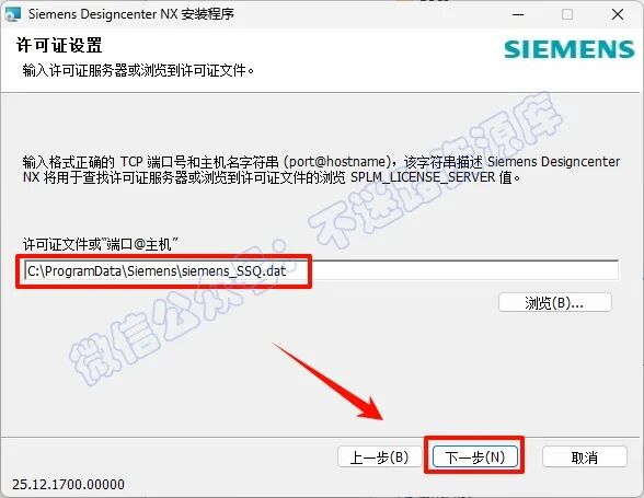 13.许可证文件或”端口@主机”确认填写:C:\ProgramData\Siemens\siemens_SSQ.dat,点击“下一步”