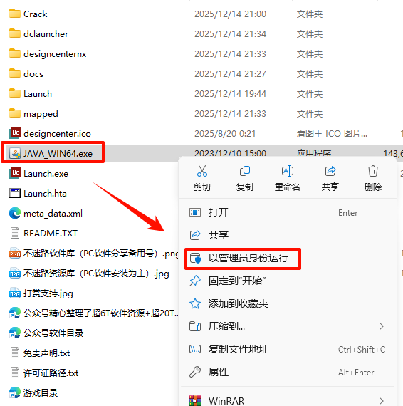 2.打开刚刚解压的文件夹,鼠标右键点击“JAVA-x64位.exe”选择“以管理员身份运行”