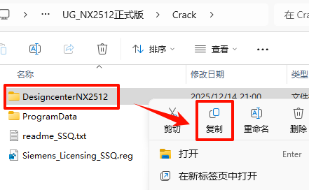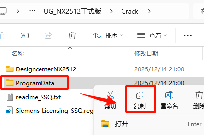 6.返回之前解压的“UG_NX2512正式版”文件夹,双击打开“Crack”文件夹,鼠标右键点击“ProgramData”文件夹选择“复制”