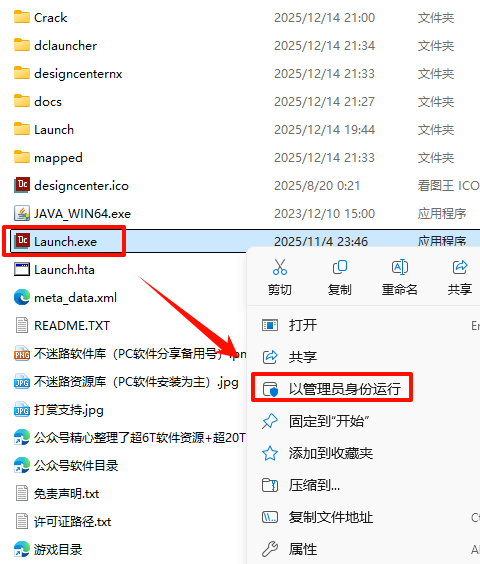 8.返回之前解压的“UG_NX2512正式版”文件夹,选中“Launch.exe”文件,鼠标右键点击“以管理员身份运行