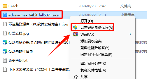 2.打开刚刚解压的文件夹,找到“edraw-max_64bit_full5371.exe”文件,鼠标右击选择“以管理员身份运行”