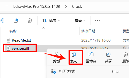 10.返回之前解压的“EdrawMax Pro 15.0.2.1409”文件夹,双击打开“Crack”文件夹,选中“version.dll”文件,鼠标右键选择“复制“