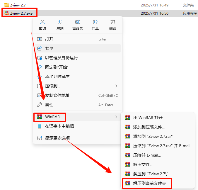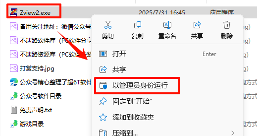 2.打开刚刚解压的文件夹,鼠标右键点击“Zview2.exe”选择“以管理员身份运行”