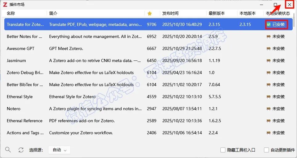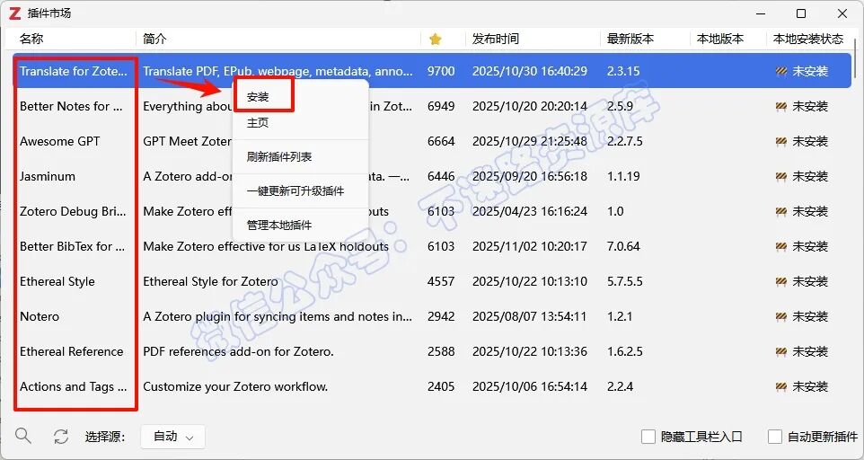 15.选中需要安装的插件,这里选择“translate-for-zotero”翻译插件,鼠标右键选择“安装”等待完成