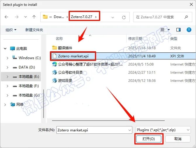 12.选择安装包文件夹位置,选中“Zotero market.xpi”插件市场,点击“打开”