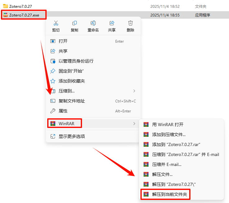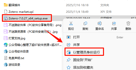 2.打开刚刚解压的文件夹,鼠标右键点击“Zotero-7.0.27_x64_setup.exe”选择“以管理员身份运行”