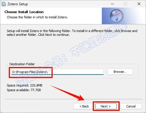 5.选择软件安装路径,建议和教程中的保持一致,本例安装到D盘(将路径地址中的首字符C改为D表示安装到D盘,安装路径不要出现中文),点击“Next”