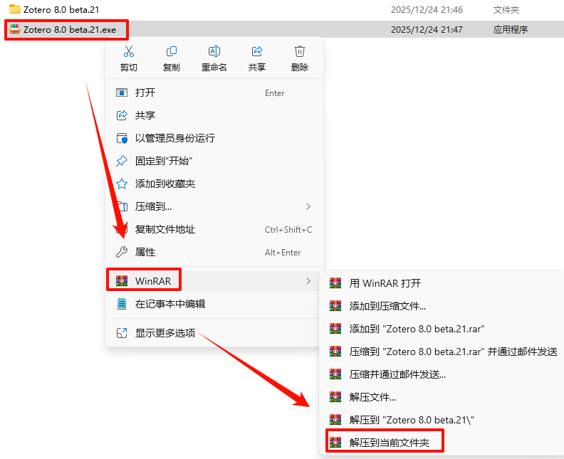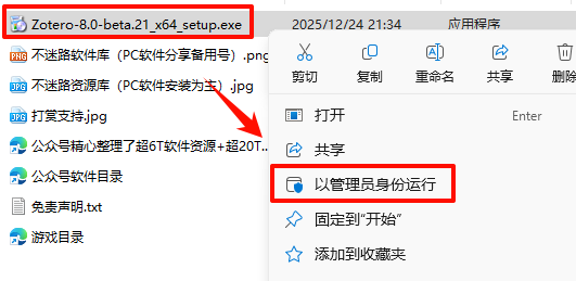 2.打开刚刚解压的文件夹,鼠标右键点击“Zotero-8.0-beta.21_x64_setup.exe”选择“以管理员身份运行”