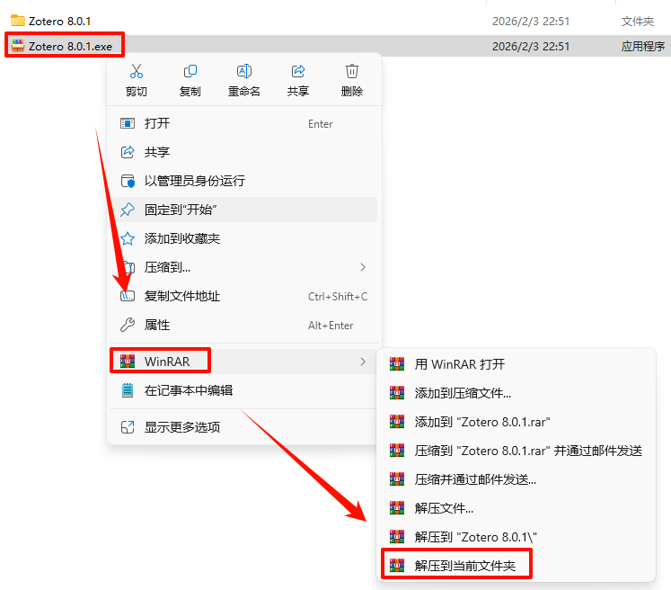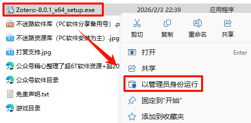 2.打开刚刚解压的文件夹,鼠标右键点击“Zotero-8.0.1_x64_setup.exe”选择“以管理员身份运行”