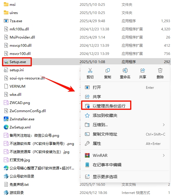 2.打开刚刚解压的文件夹,鼠标右键点击“Setup.exe”选择“以管理员身份运行”