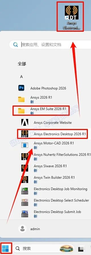 28.µã»÷“¿ªÊ¼“²Ëµ¥À¸£¬µã»÷Õ¹¿ª“Ansys EM Suite 2026 R1“£¬ÕÒµ½“Ansys Electronics Desktop 2026 R1“Èí¼þ£¬Êó±ê×ó¼üÍÏ×§µ½×ÀÃæÉϼ´¿É´´½¨×ÀÃæ¿ì½Ý·½Ê½