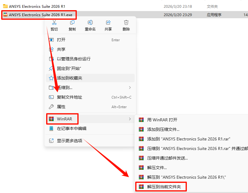 2.´ò¿ª¸Õ¸Õ½âѹµÄÎļþ¼Ð£¬Ë«»÷´ò¿ª“Ansys EM 2026 R1”Îļþ¼Ð£¬Êó±êÓÒ¼üµã»÷“Ansys EM 2026 R1 °²×°Ïòµ¼.exe”Ñ¡Ôñ“ÒÔ¹ÜÀíÔ±Éí·ÝÔËÐД