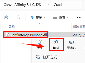 6.返回之前解压的“Canva Affinity 3.1.0.4231”文件夹,双击打开“Crack”文件夹,选中“Serif.Interop.Persona.dll”文件,鼠标右键点击“复制”