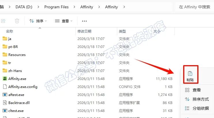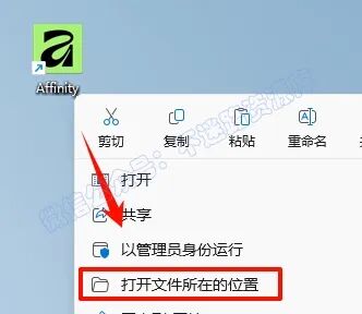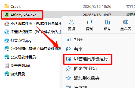 2.打开刚刚解压的文件夹,鼠标右键点击“Affinity x64.exe”选择“以管理员身份运行”