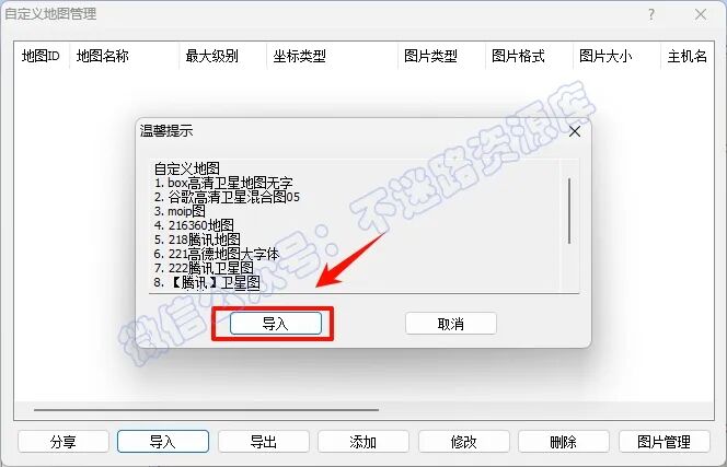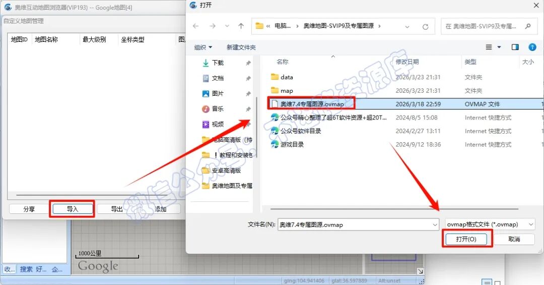 5.点击“导入”选择安装包里面的“奥维7.4专属图源.ovmap”,点击“打开”