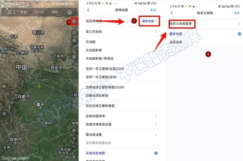 4.返回地图界面,点击“右上角图标-选择地图-自定义地图-选择刚导入的图源”