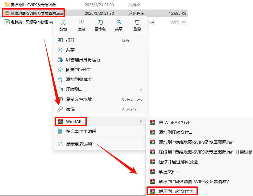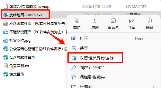 2.打开刚刚解压的文件夹,鼠标右键点击“奥维地图-SVIP9.exe”选择“以管理员身份运行”